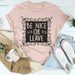Be Nice Or Leave T-Shirt - Unleash your charm with this digitally printed tee, expertly crafted in the USA. Made from 100% soft and ring-spun cotton, it ensures an amazing...