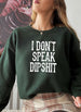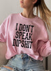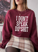 Embrace the allure of our I Dont Speak Dipshit Sweat Shirt a masterpiece of fashion and art. Made in the USA with the utmost care, this sweatshirt features digitally printed designs that are as unique as you. Crafted from high-quality cotton fleece, it provides a cozy and snug fit, perfect for chilly days. Express your individuality with this sweatshirt that combines comfort and style in one.